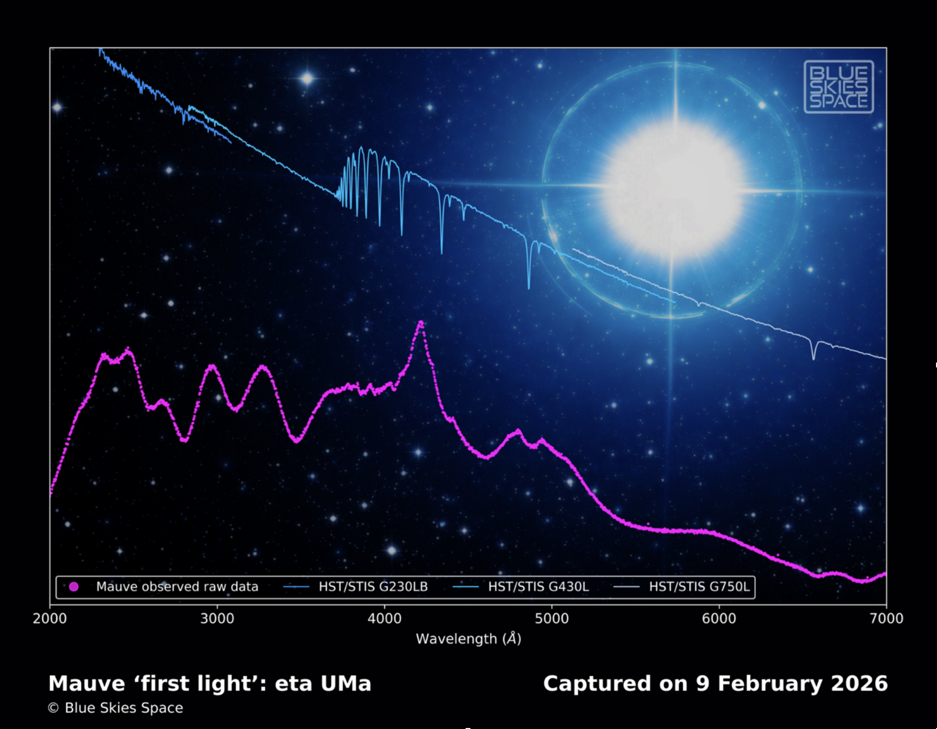 Mauve launched aboard a SpaceX rocket in November 2025 and in February 2026 captured its first observation: a star called eta Ursae Majoris, 104 light-years away in the constellation Ursa Major. The data confirms all systems are operational and marks the beginning of Mauve's science programme in earnest.